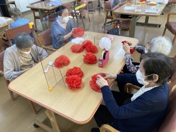 男性陣は折り紙を短冊状に切った輪飾り、女性陣はお花紙で花づくりを、皆様真剣な