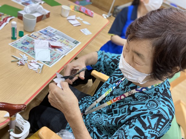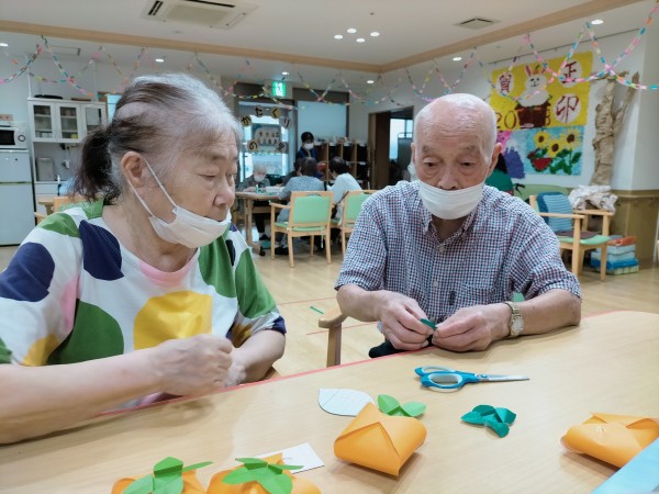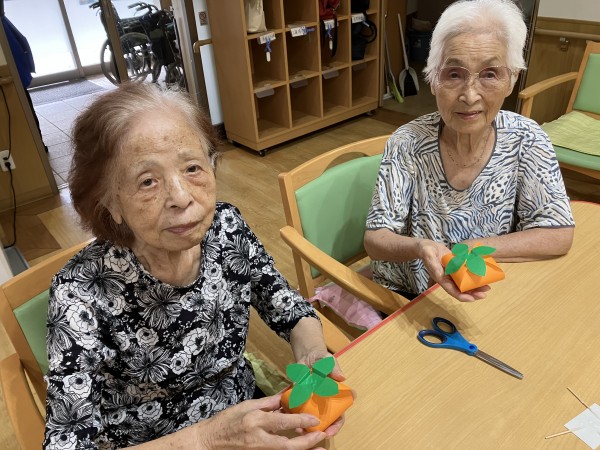 秋の制作では、折り紙を使用して『柿』と『落ち葉のガーランド』を作りました!
