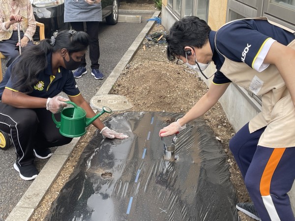 まずは、畝を作ってビニールがかけてあるところに穴を開けていきます!!