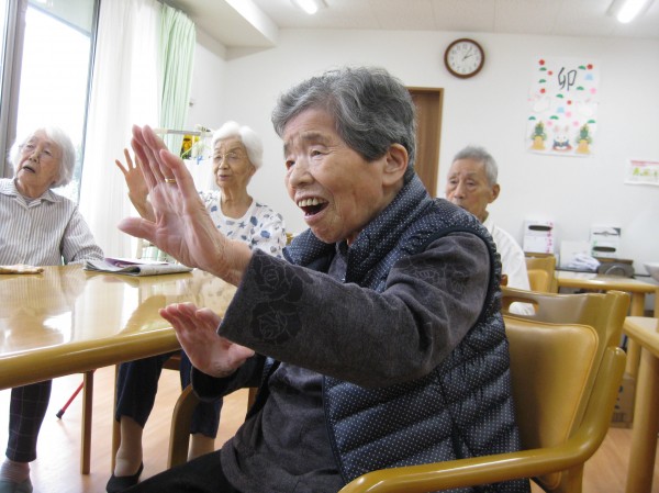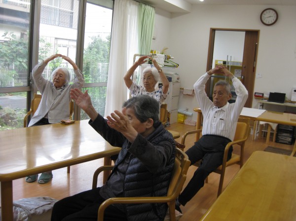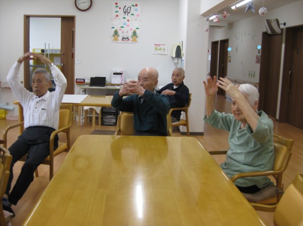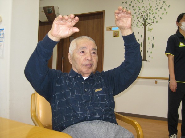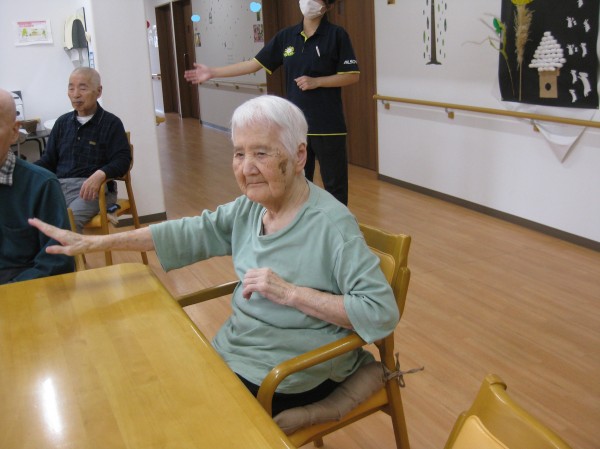 手を上げて手を下げて・・・ みなさましっかりと身体を動かされています。リズムに合わせて楽しまれ運動されています(*^。^*)