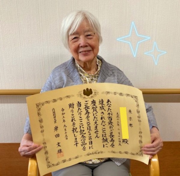 来年で100歳を迎えるご予定のご入居者様のS様に、内閣総理大臣からお祝い状と記念品が届きました♪