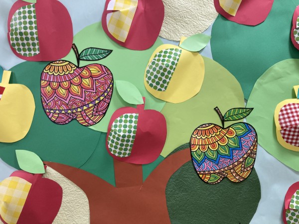 1つ目は、画用紙をリンゴの形に切ってチェック柄やドットの用紙を貼り合わせてできています。