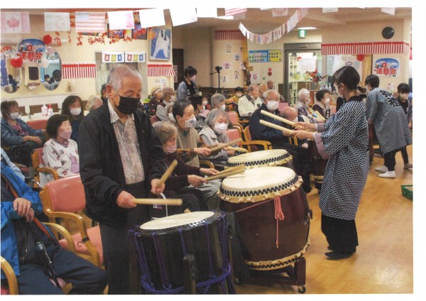 本日午後のレクリエーションは、新河岸太鼓の皆様6名による【和太鼓の演舞】です。デイサービスでは初めての和太鼓のイベント。お祭りや盆踊りでの太鼓はよく聞きますが、大小様々な種類の太鼓を持ち込んでの本格的な演奏を目の前で聞く機会は稀ではないでしょうか。始まるや否や、和太鼓の迫力に圧倒されてしまいました。笛や音楽に合わせての演舞、すべてが素晴らしく身体に響く和太鼓の音色を堪能することができました。また、体験する機会も設けてくださりバチをもって太鼓を叩き一緒に演奏するというスペシャルな経験もさせていただきました。職員も皆様も大満足のイベントになりました。新河岸太鼓の皆様ありがとうございます。