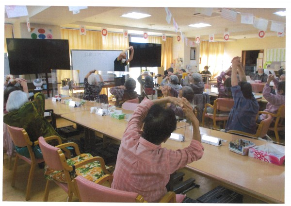 本日午後のレクリエーションは【ノーアエクササイズ】です。とっても司会の上手な末次職員の指導で皆様、笑いが多めながらもしっかりと身体を動かされていらっしゃいました。声を出し手足を動かすことで、脳の血流が良くなるというエクササイズですが、笑うのも体に良いと聞きます。今日はいつもより脳力アップしたのではないでしょうか♪