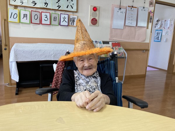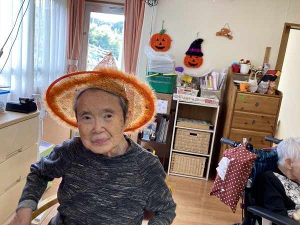 ホームも少しだけ、ハロウィーンの飾り付けをしたので、入居者様もちょこっと変身です。
