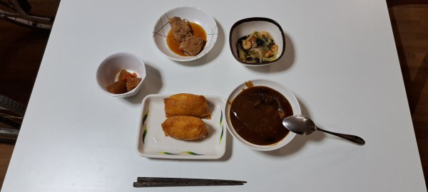 出来上がり、「美味しそうですね。いただきます。とても美味しいです。ビーフシチュー何杯も食べれますよ。稲荷寿司も何個もおかわりできますよ。」と