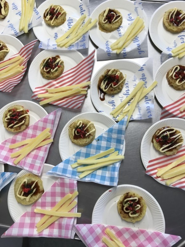 お好み焼きにチータラをおしゃれに盛り付け、枝豆や冷奴などを提供させて頂き