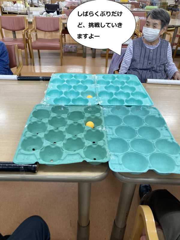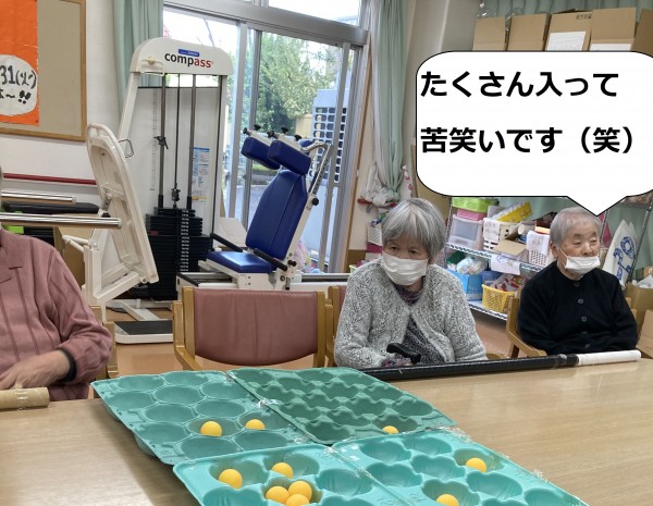 そんな今回のレクリエーションですが、14日(土曜)に行いました「ピンポン玉入れ」の模様をお送りしたいと思います♪