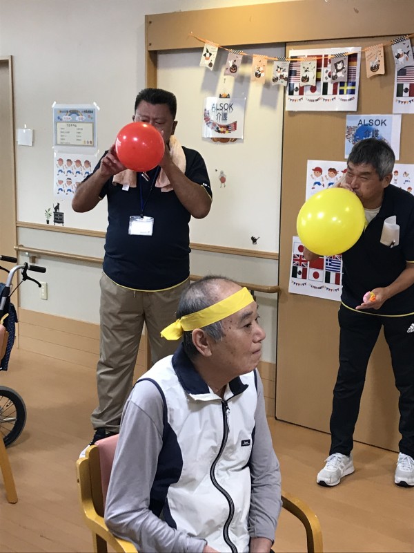 スタッフによる風船人間ポンプ対決‼ 競技① 旗揚げ‼