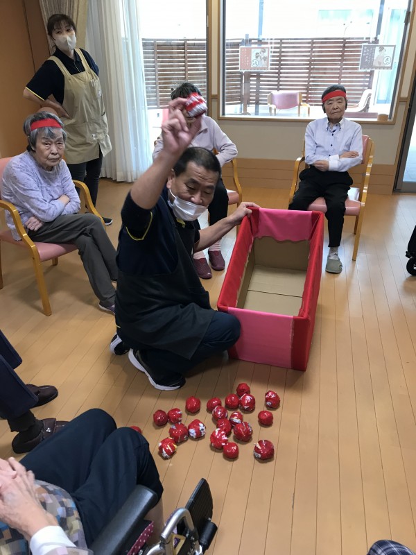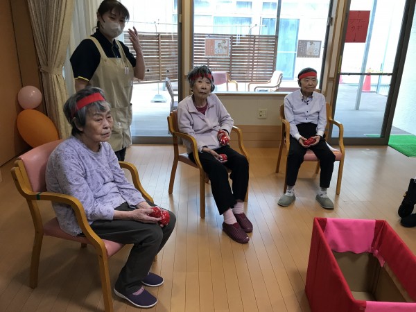 競技③玉入れ‼ 持ち玉3個を慎重に箱の中へ‼