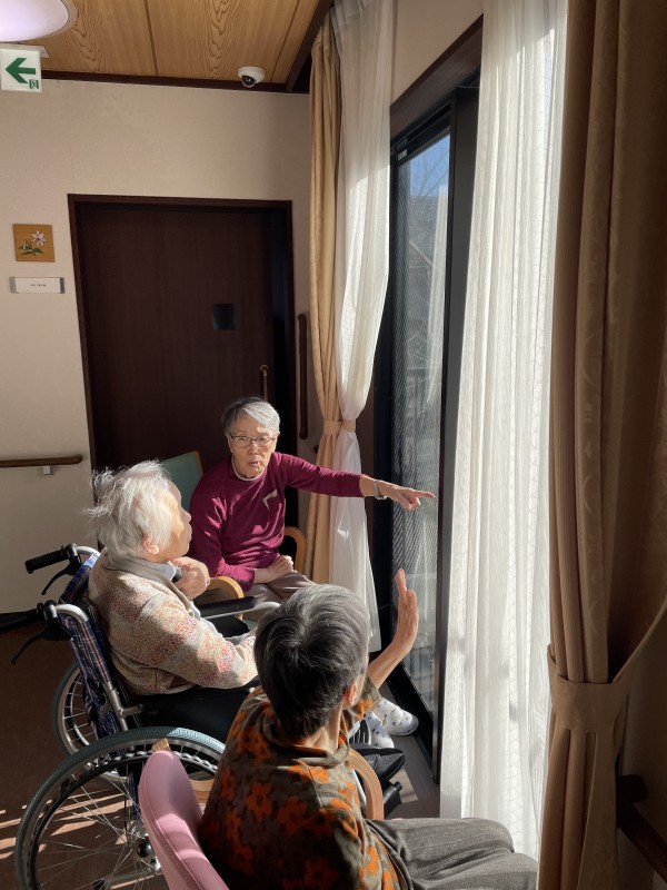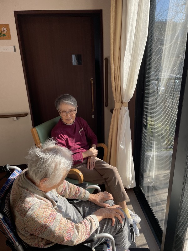 この場所で入居者様が陽の光にあたりながら会話を楽しまれています。