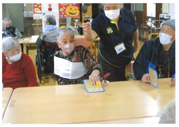 本日午後のレクリエーションは【ピンポンゲーム】です。6台のテーブルをピンポン台にして、段ボールのラケットでピンポンを楽しみます。卓球の様に1対1でなく、全員で楽しめるようになっています。ラリーの回数を決めて挑戦したり、何回続くか挑戦したりと職員がお題を決めて楽しくピンポンされていました。卓球は経験者も多いようで、みなさまとてもお上手でした。早い球を追うのは動体視力を鍛えるとのこと。楽しみながら脳力も鍛えることができるなんてすばらしいですね♪