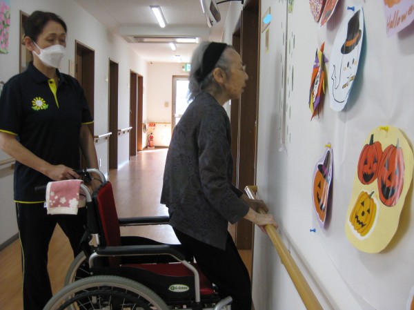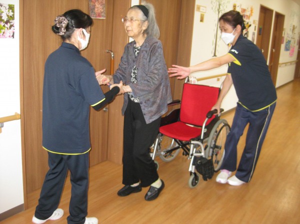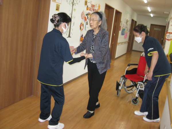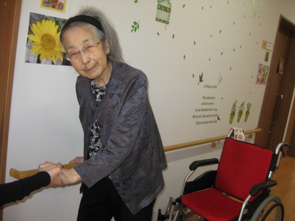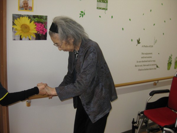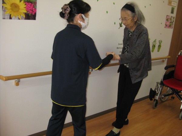 立てるわよ!歩けるわよ!と話されています(*^。^*) 立つことから始めました。つかまって歩かれているご様子です!!