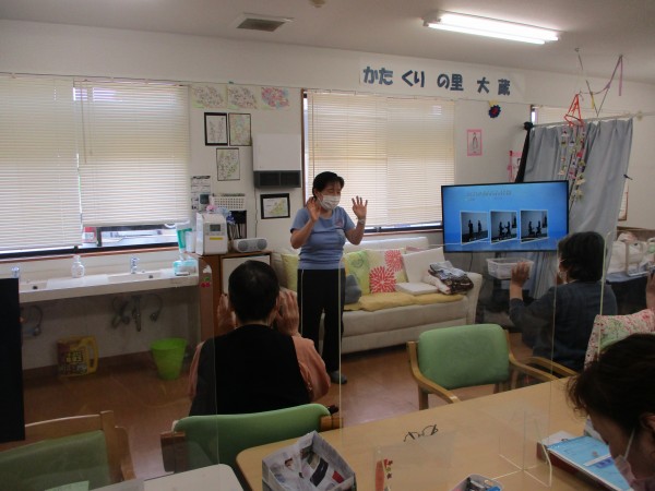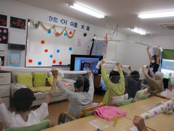 本社にある「健康増進課」の講師陣による様々な体操があります。皆様、毎回集中して楽しく取り組まれていらっしゃいます。