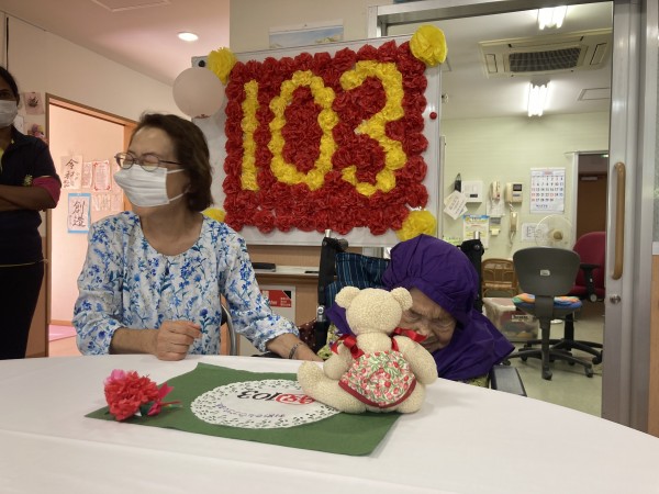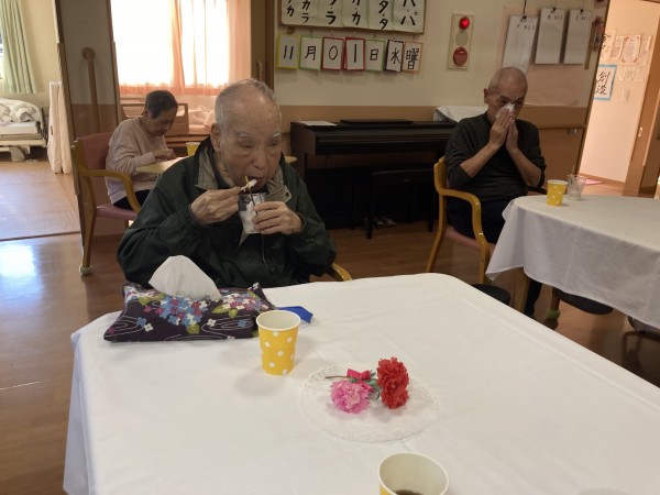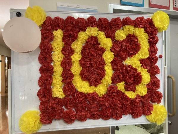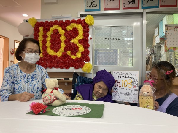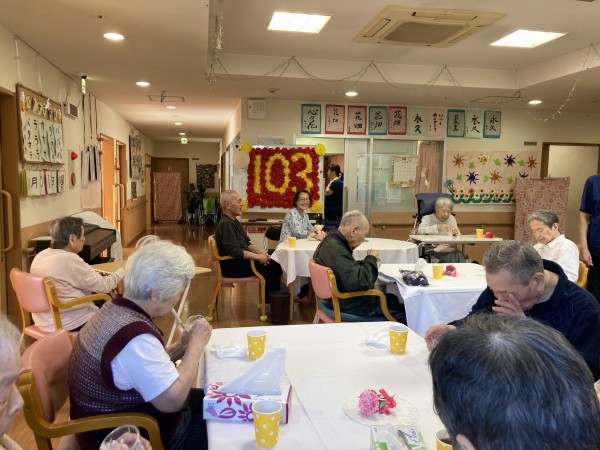 11月も気が付けば半ばを過ぎて、日中帯も一気に冬らしい空気になってきましたね~。今回は月初めの出来事だったのですが、御年103歳を迎えられた入居者様のお誕生日会の様子をお伝えしていきたいと思います。