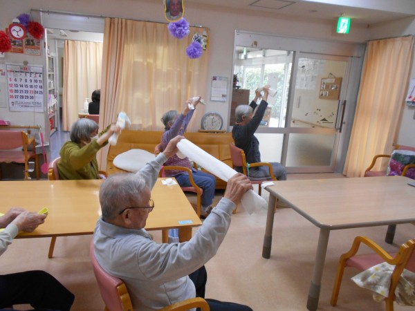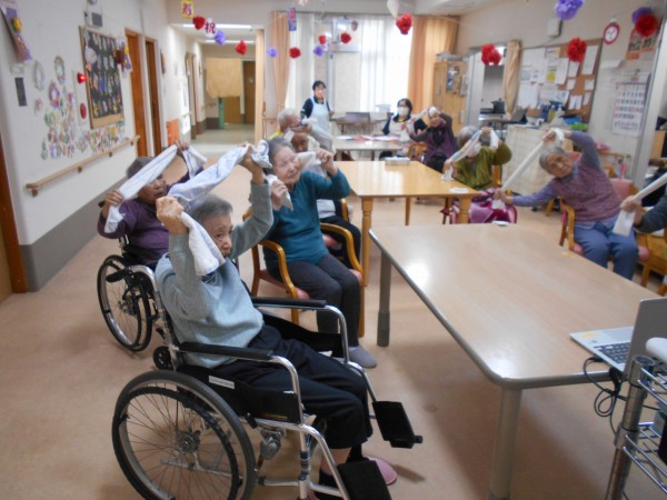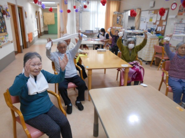 タオルを使って体を動かし、健康の維持に努めました。