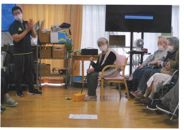 本日午後のレクリエーションは【ホールでゴルフ】です。職員お手製のクラブとボールでなんちゃってゴルフ、距離でポイントを競うのですが強すぎればOB、弱すぎればOBと絶妙な力加減が必要なゴルフです。本来のゴルフとは全く勝手が違うので、ゴルフ経験は関係ありません。力がなくてもクラブを振ってボールに当てることさえできればポイントが取れるので誰でも楽しめます。職員が思いっきり空振りして大爆笑が起こっていました、今日も楽しく盛り上がりました♪