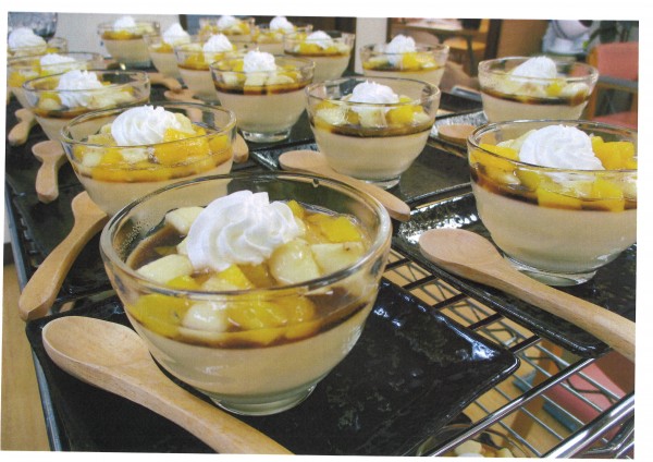 本日のおやつは【手作りプリン】、秋色のプリンということで、桃缶とバナナをシロップで和えトッピングしました。ホイップクリームもいつもより多めでボリューム満点です。皆様にも美味しいと好評でした♪