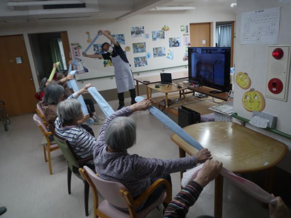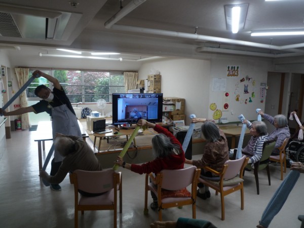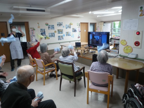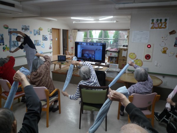 職員も一緒にタオルを使って