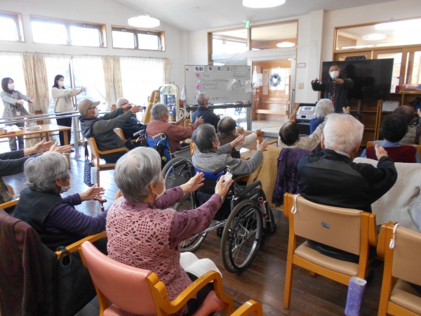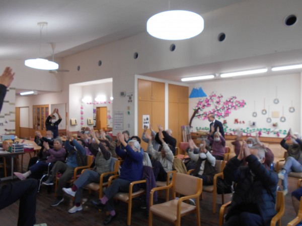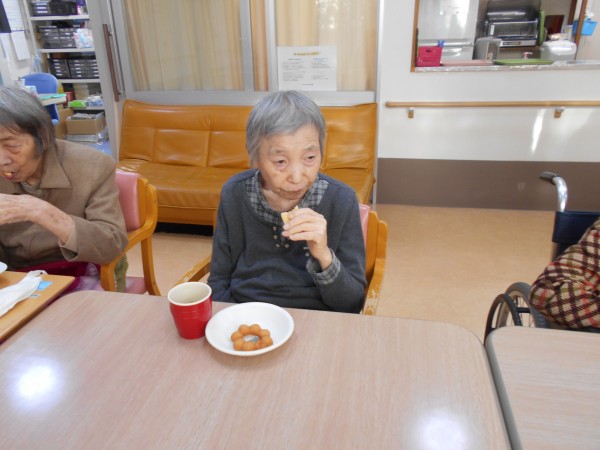 デイサービスの利用者様と一緒に体操した後、ホームでおやつを食べ、地域の方々と交流しました。