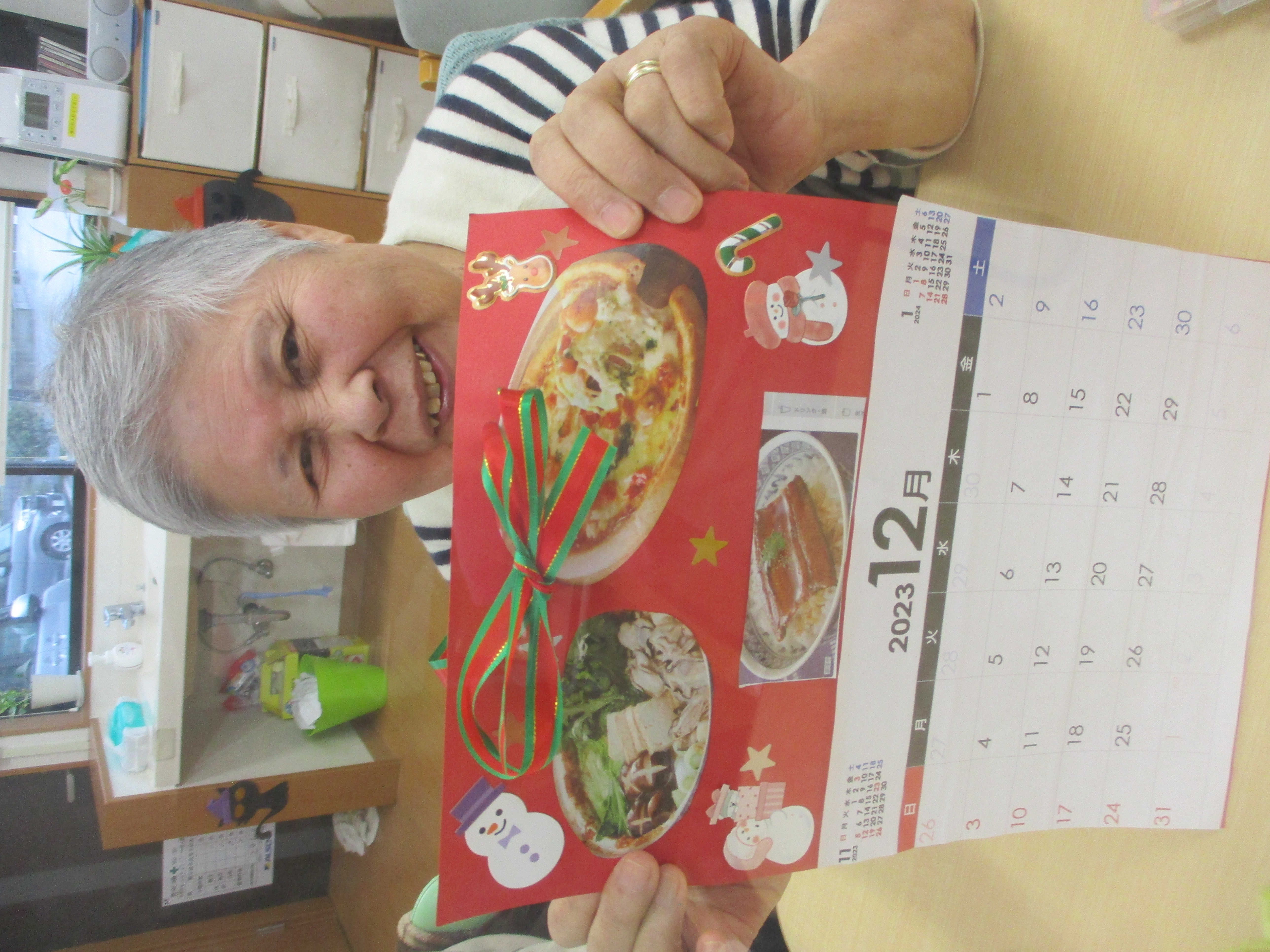 毎月製作するのを楽しみにされている「12月のカレンダー」です。12月のカレンダーはチラシからご馳走をそれぞれ選んでいただき、貼ってみました。