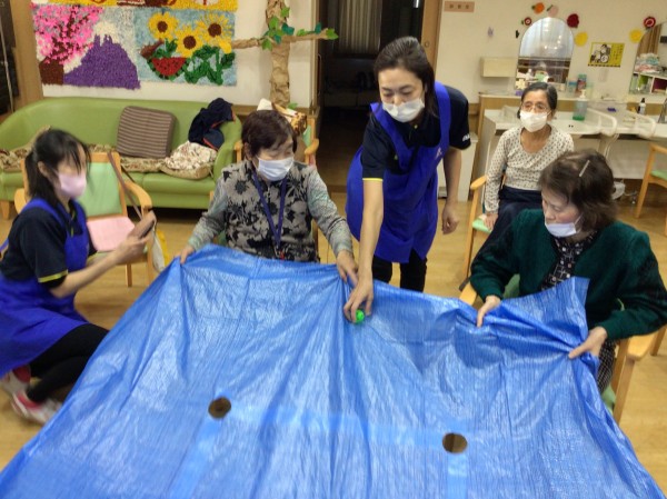 これは、皆で協力しながらブルーシートの穴にピンポン玉を入れていくゲームです。これが中々難しくて、皆さん童心にかえったように「キャーキャー」と声を上げながら楽しんでいました????