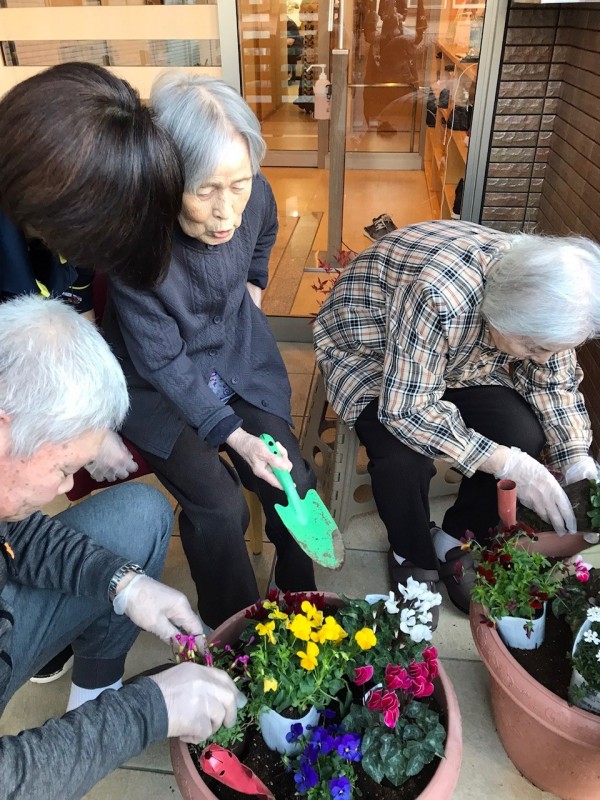 「土いじりが好きだった・・」「昔農家だったから詳しいのよ・・」と楽しそうにシャベルを持ち沢山の入居者様がお手伝い来てくださいました。