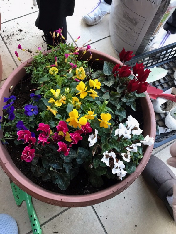 植えながら、「花の色は、青がこっちがいいね。」「赤も綺麗だね。・・やっぱりこっちいいかなぁ・・」と皆さんで相談しながら素敵な鉢植え完成しそうです。
