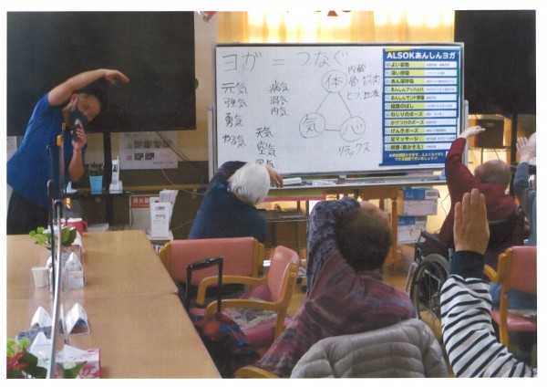 本日午後のレクリエーションは【ALSOKあんしんヨガ】です。椅子に座ったまま行えるシニア向けのヨガ、よい姿勢をとることにより姿勢改善や腰痛予防につながります。呼吸法ではリラックス効果・肩回りの可動域を広げる・体を温めることによる風邪予防・誤嚥予防、各ポーズで便秘・冷え性・転倒予防・筋肉の強化、瞑想で不眠の改善等、様々な効果が期待できます。ALSOKあんしんヨガは『頑張りすぎず、人とくらべずにできる範囲で行いましょう』がモットー。皆様熱心に取り組まれていらっしゃいました。