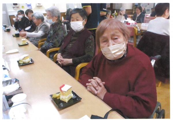 本日のおやつはクリスマスケーキです。切るのがかわいそうになってしまうほどとってもかわいいケーキです。ケーキにはお口直しのポテトチップを添えました。やっぱり、ケーキって人を笑顔にしてしまう食べ物ですね!おいしゅうございました♪