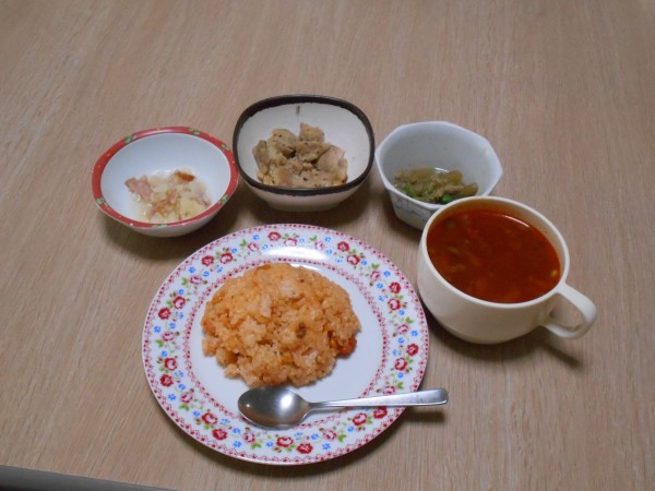 昼食はチキンライスとミネストローネ。