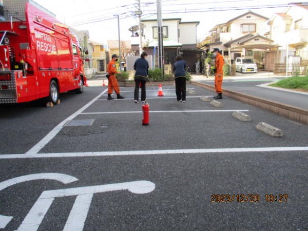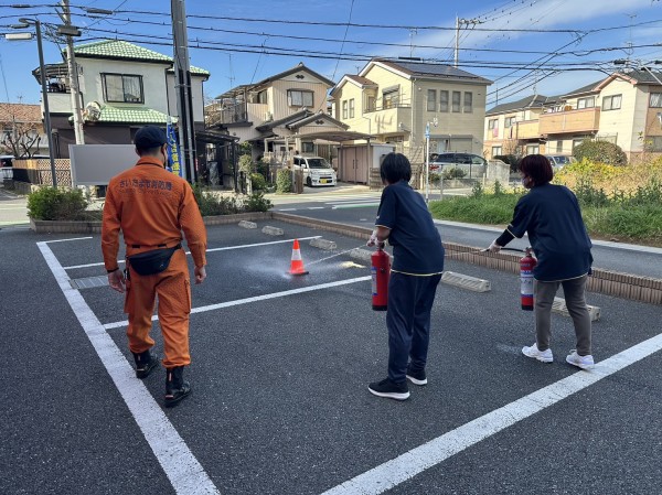 避難訓練を終えた後、施設の外で消化器の仕方を教えてもらいました!
