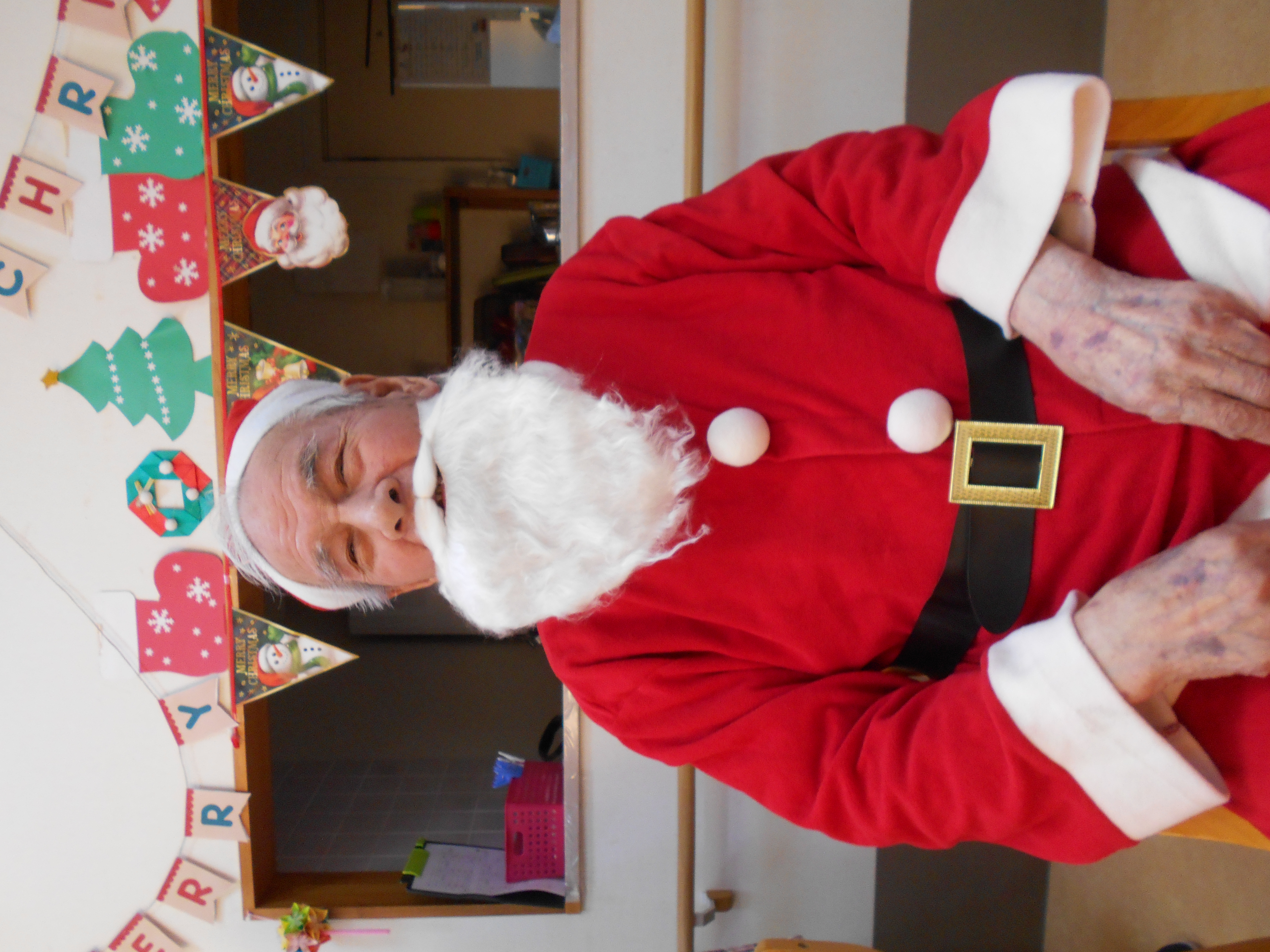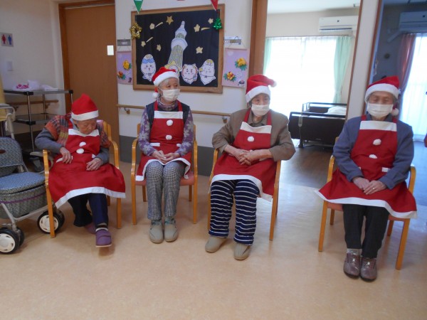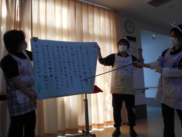 入居者様にもサンタ帽をかぶっていただき、合唱やスタッフの寸劇などを楽しんでいただきました。