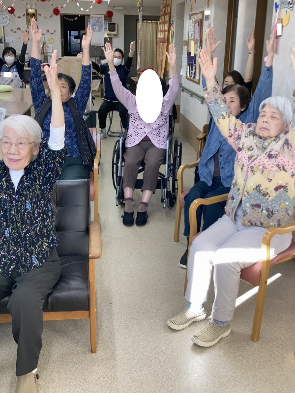 この後は、足あげの運動や数に合わせて、手を叩いたり足を広げたり、なかなか高度な運動を行い、職員が必至になっていました(>_<)