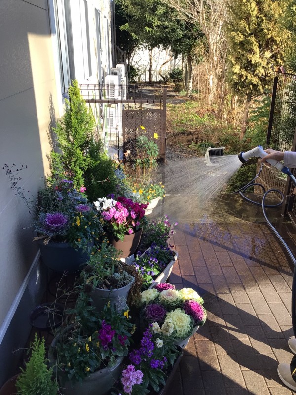 今日は玄関前にあるお花の水やりを手伝ってもらいましたd (>◇< )
