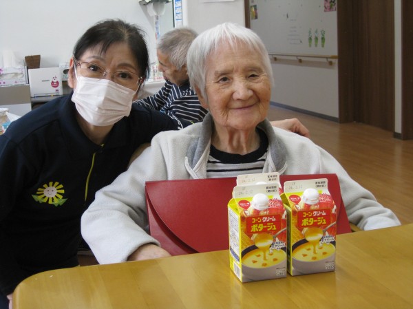 早速召し上がっていただきました。コーンスープをあっという間に飲み干されました(*^_^*)