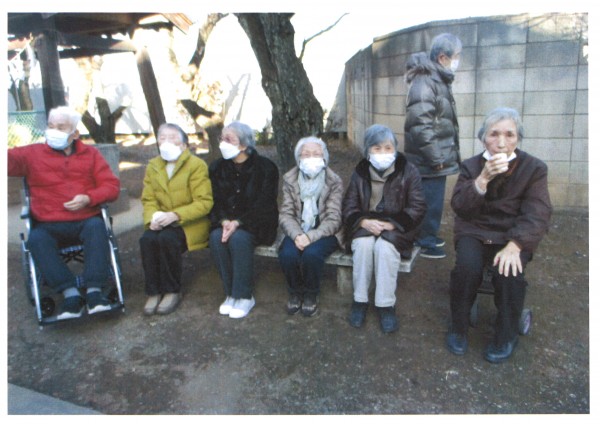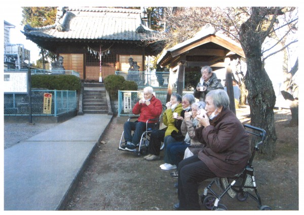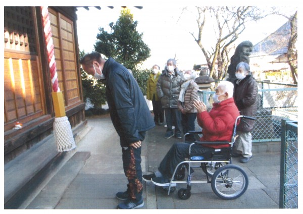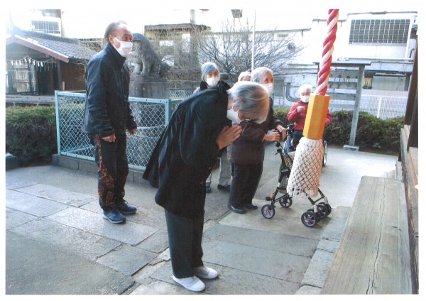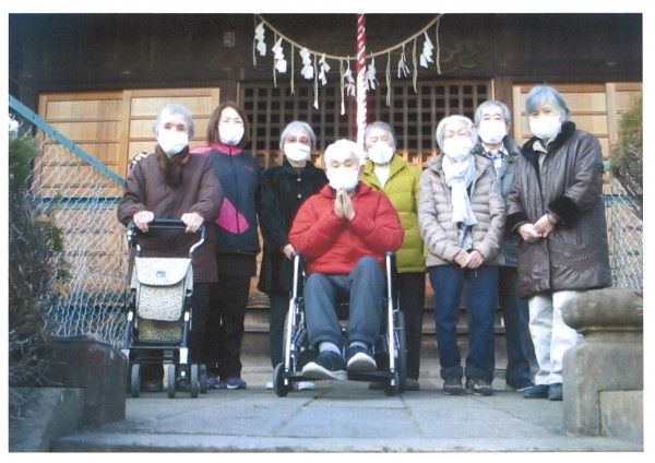 本日よりご希望の方のみ、近くの神社へ初詣。もう初詣はお済みの方も地域の氏神様に感謝を捧げ、お願い事をするいい機会ではないでしょうか。昼食が終わり一息ついてから神社へ、冬なの?と思うほどお天気に恵まれ少し汗ばむほど。梅の花もいくつか咲くほどです。お参りに参加された方もこれも神様のおかげと感謝されていらっしゃいました。お参りの後ベンチに座り紅茶をのんで和やかに参拝ツアー第一弾終了です♪