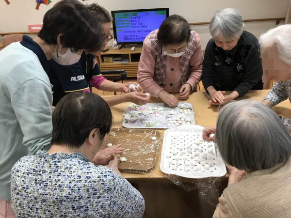 ご利用者様も団子作りを手伝われ、あっという間に人数分が出来上がりました!食べやすくて好評でした♪