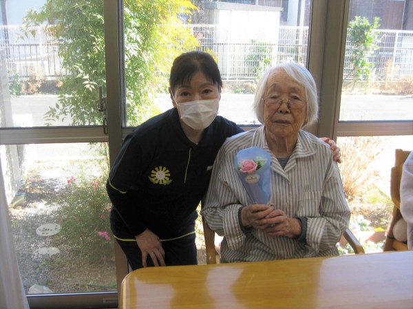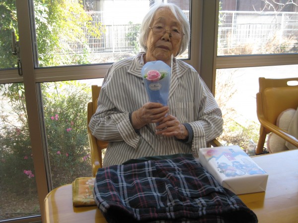 お誕生日おめでとうございます。1/13で95歳になりました。お花とズボンとお菓子を頂きました????