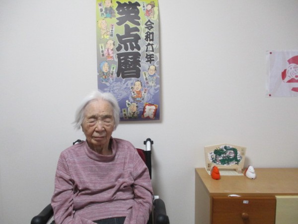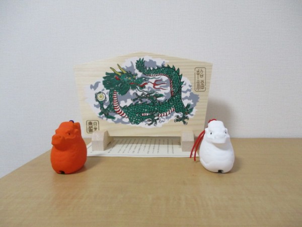 絵馬・2024年のカレンダー・今年の干支の辰の置物をお持ちになられました。居室に飾りました。 写真を撮ったら目を閉じてしまいました。