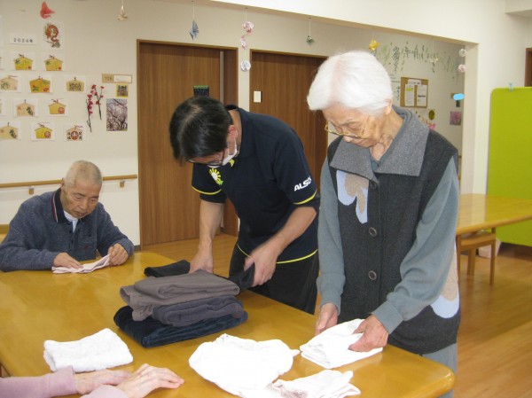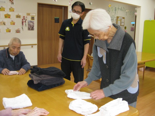 こんにちは! グループホームみんなの家・あきがせの介護ブログです! よろしくお願いいたします。 今日はお手伝い(お洗濯物畳に)のご様子をお知らせいたします!!