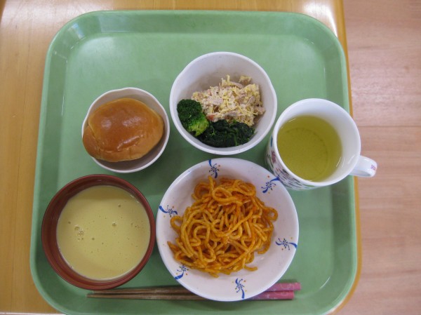 ナポリタン・パン・サラダ・コーンスープのお食事です( ^ω^)・・・