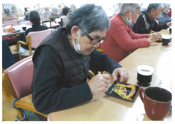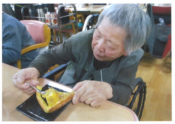 本日のおやつは【センター長の手作りおやつ】です。今回は、食パンとバナナを使ったおやつ。ホットプレートでパンにしみた卵液が固まれは完成。お味はフレンチトースト・バナナ版といった感じでしょうか。センター長の手作りおやつ、皆様に美味しいと大好評!今回も大成功でした♪