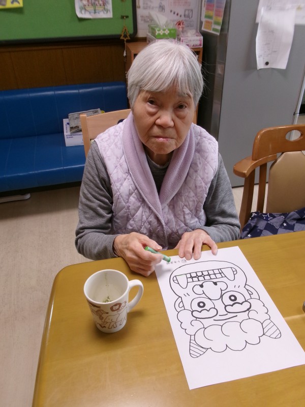 3. 1/28 昼下がり、節分に向けて鬼の塗り絵を致しました!色んな鬼さんが出来ました!私に似てる~!っと笑う利用者様(>_