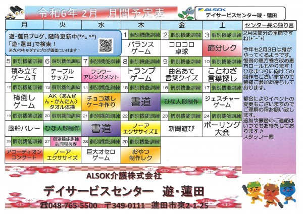 本日の遊蓮田は、2月の予定表が完成しましたのでそちらのご紹介となります!