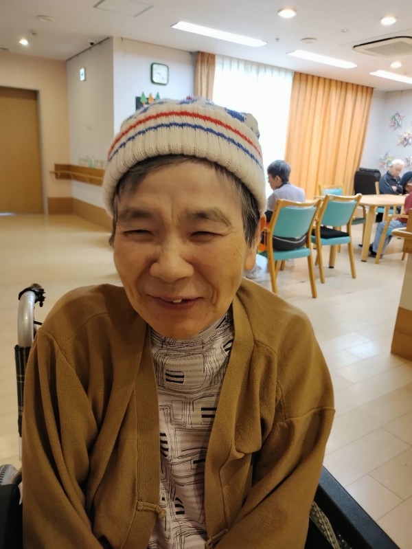 可愛いニット帽を被っています(^^)ちょっとお借りして・・・お母様に合わせてみたところとってもお似合いです(^^)