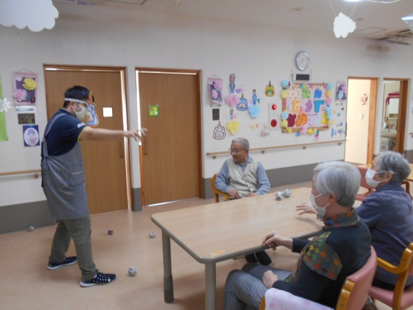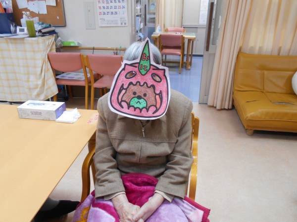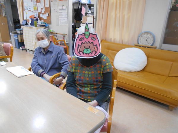 皆さまで鬼のお面をかぶったり、鬼の職員に皆様で豆まきを行ったりしました。