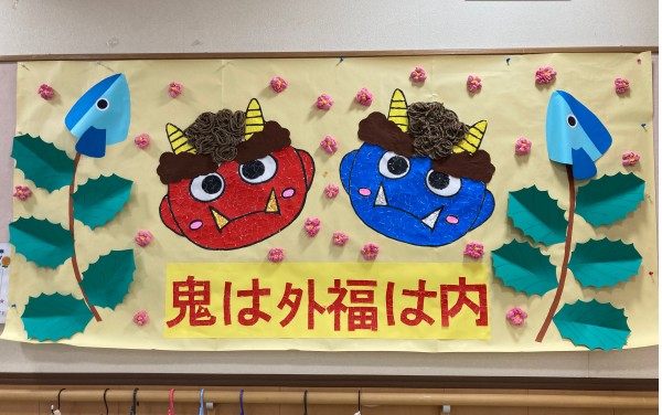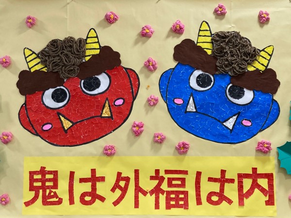 赤鬼と青鬼&【鬼は外 福は内】の文字は、ご利用者様に折り紙をちぎって貼っていただきました(*^-^*)