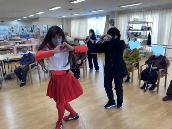 職員が仮装して、チョコレートを持って、告白するという寸劇を行いました。