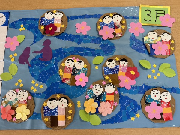 ◎模造紙に、川を『ちぎり絵』で貼っていき、おひなさまをバランスを考えながら貼っていき、完成〜♡